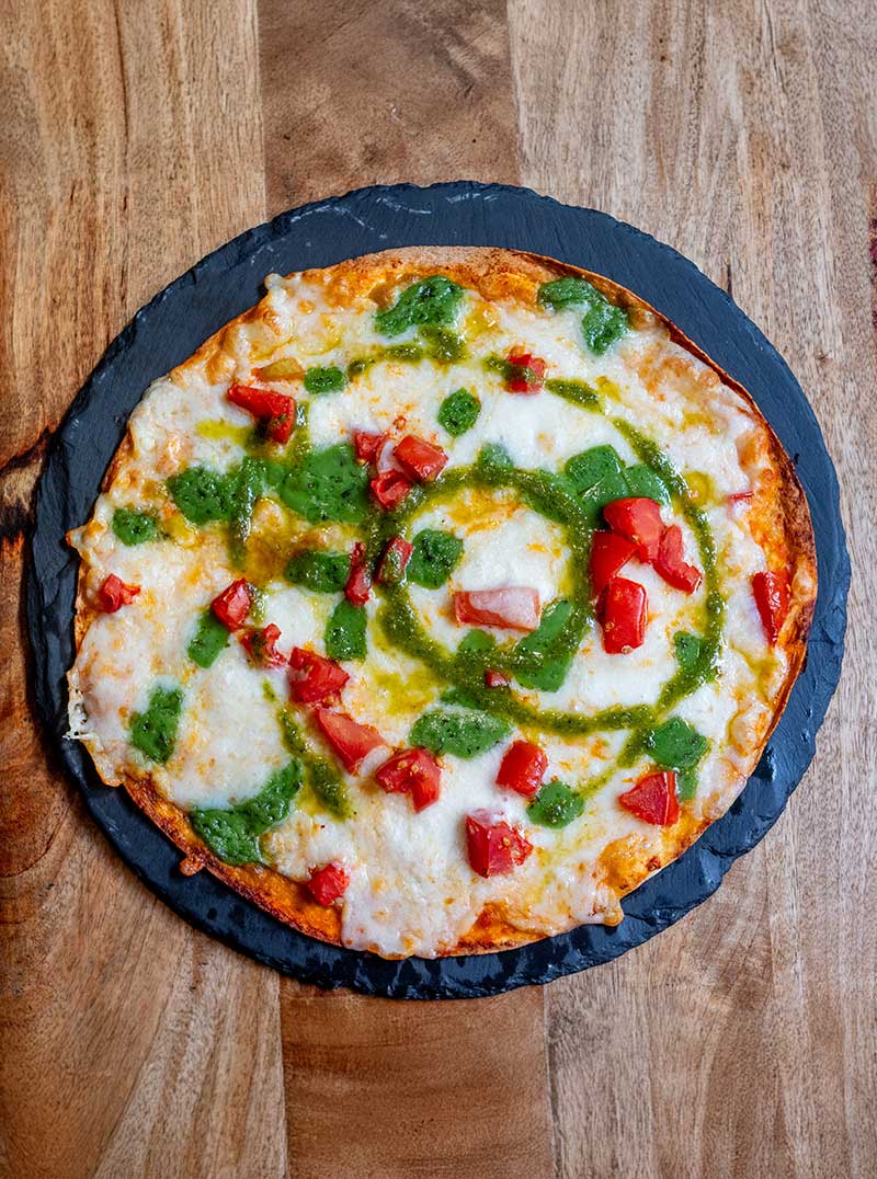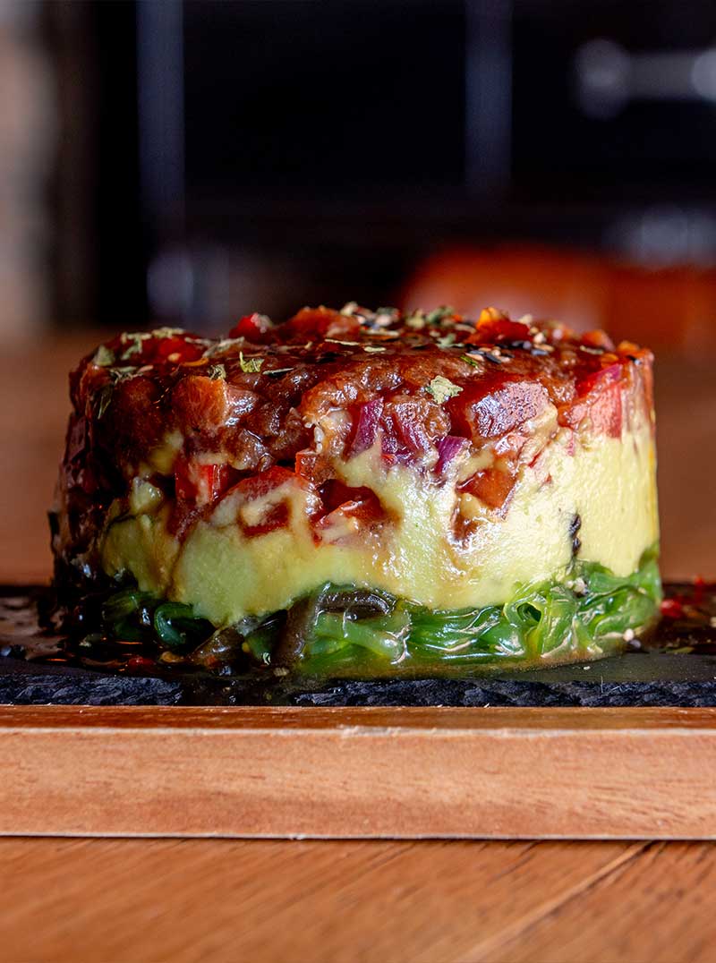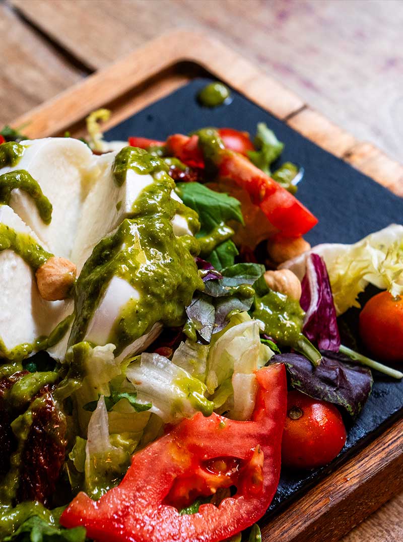 Ensalada templada de queso azul, tomate seco, frutos secos, manzana y miel